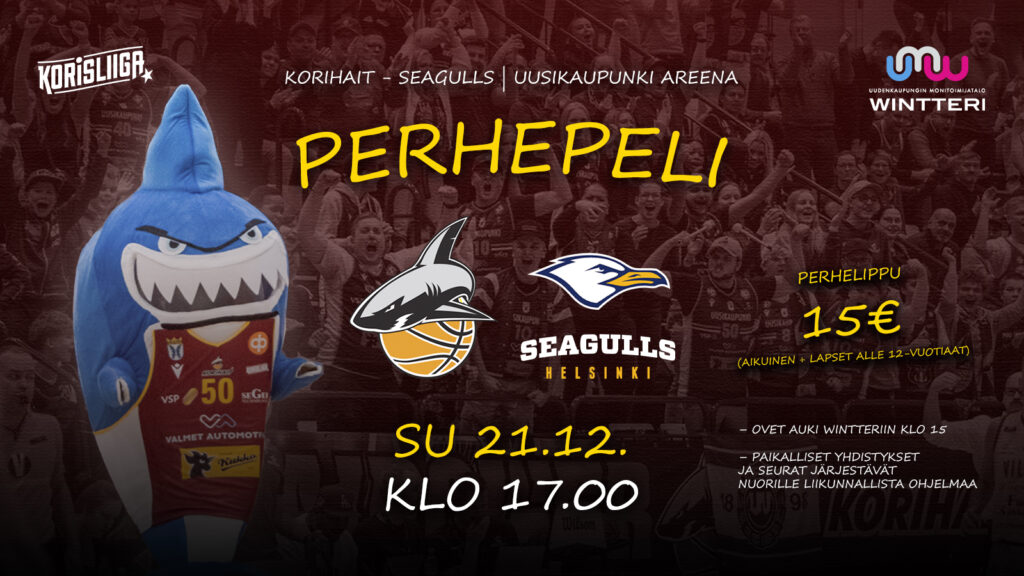 Tervetuloa viettämään koko perheen pelipäivää sunnuntaina Wintteriin! Ohjelmassa on liikunnallista tekemistä perheen pienimmille ennen klo 17 alkavaa Korisliiga-ottelua Korihait-Seagulls!